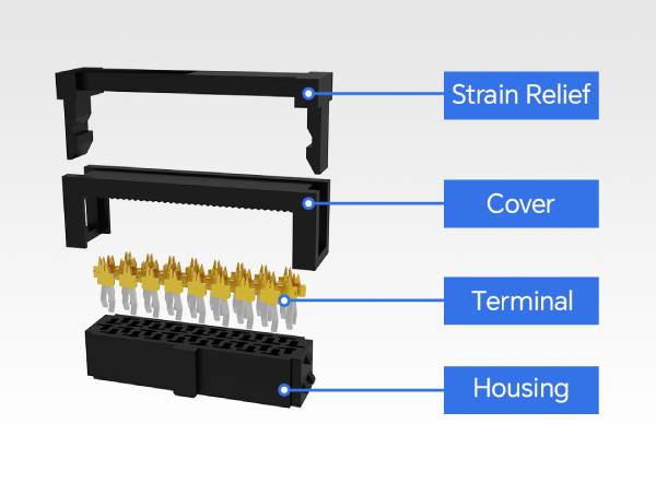 1. IDC W/O  Strain Reli,其中公端和母端使用 IDC 技術(shù)直接連接,支持 AWG 28-22 的線(xiàn)規(guī),將裝配效率提高 30%。
